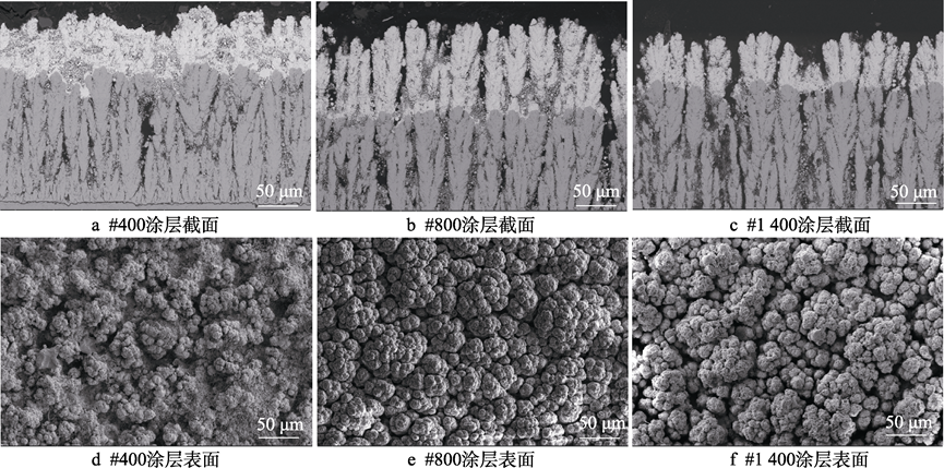 2)团聚粉末的粒度越小,其在等离子焰流中的气化率越高。#400涂层形成的柱状晶结构不明显,说明团聚粉末在等离子焰流中未气化完全,而是以液滴和未熔粒子的形式互相堆积而形成涂层。#1400涂层与#800涂层均以气相沉积为主,涂层呈典型的羽毛–柱状结构,且#1400涂层中的未熔粒子较#800涂层明显减少,气化率达到最高。但#1400涂层由于其粉末粒度过小,以及流动性较差,送粉的过程中部分粉末未能顺利地通过喷嘴到达等离子焰流的中心,涂层的沉积率会略微降低。