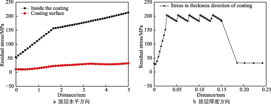 1)计算机模拟单层通道等离子喷涂ZrO2涂层,冷却后其内部的残余应力主要集中在热流中心区域,涂层内部最大的内应力为径向拉应力,涂层的等效应力为160~220 MPa的残余拉应力。