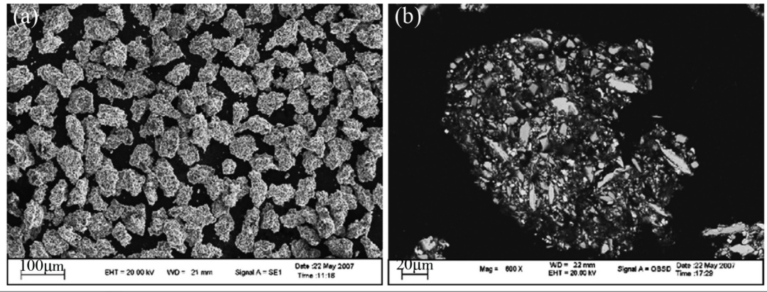以蔗糖为碳源制备的TiC增强Fe36Ni合金复合粉末的SEM图和截面形貌图